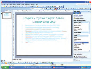 4) Pilihlah salah satu jenis animasi, misalnya Fade In One by One. Untuk melihat hasil animasi, klik tombol Play. Untuk melihat hasil animasi satu layar penuh (full screen), klik tombol Slide Show.